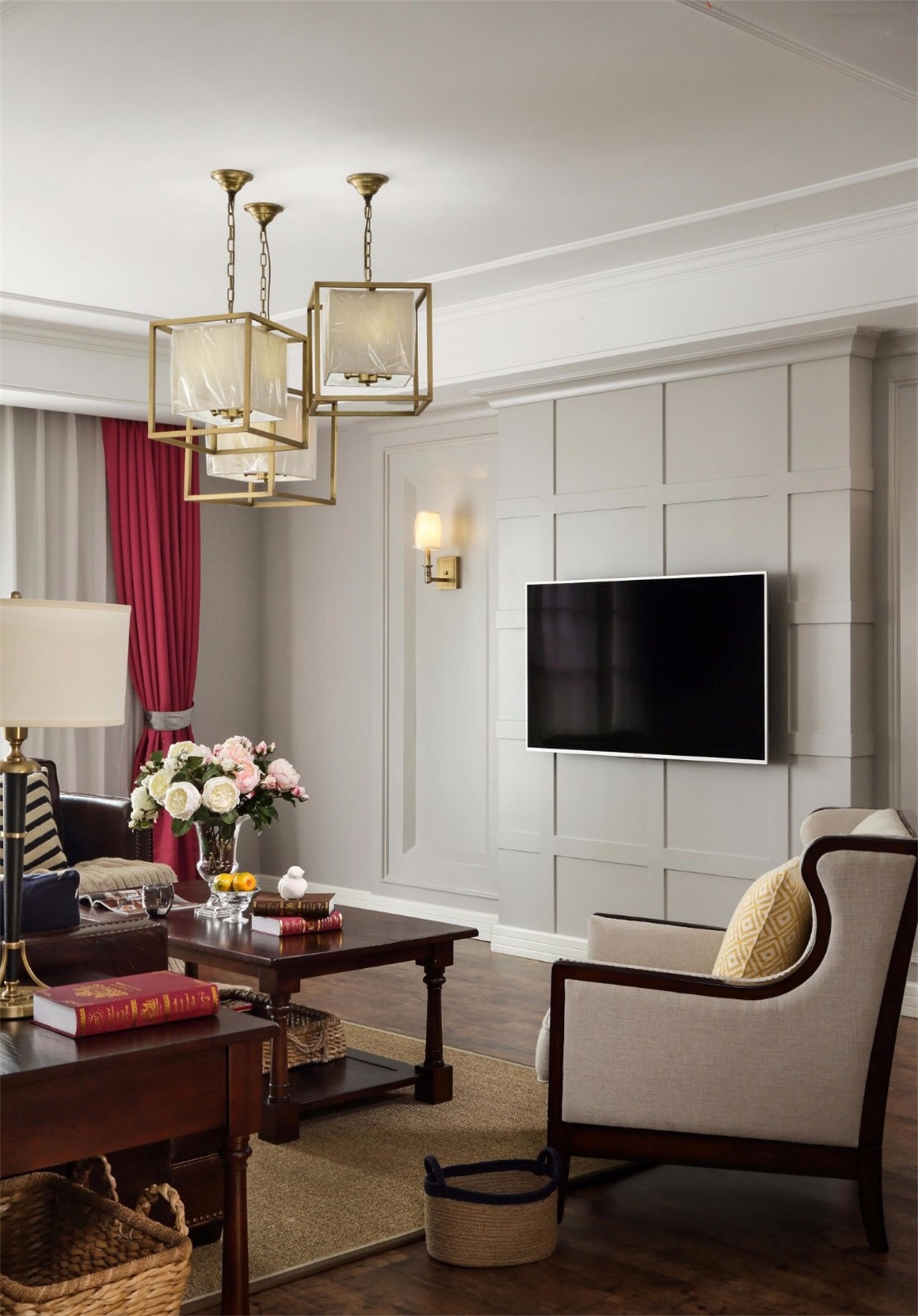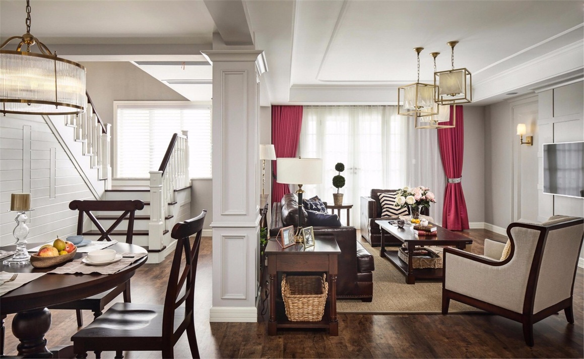 木地板、不銹鋼線條、定制實(shí)木護(hù)墻板、乳膠漆。